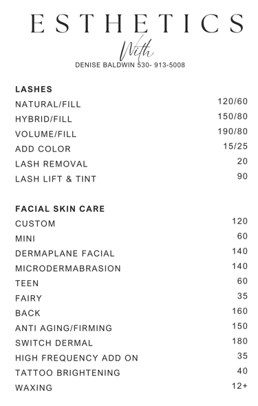 Esthetics with Denise Baldwin: https://aurorabeautyandlashstudio.glossgenius.com